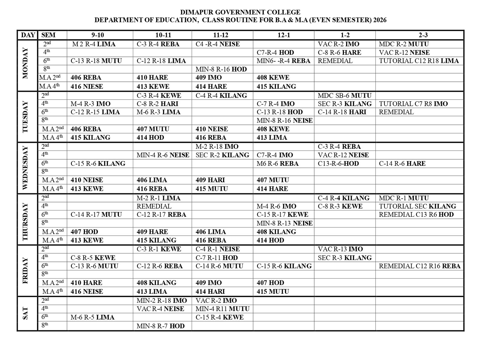 Department of Education Class Routine